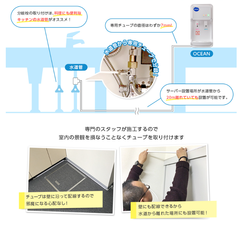 OCEANは水道直結型のため、設置時に簡単な工事が必要になる場合があります。ただし、専門スタッフが対応するため、特別な準備はほとんど不要です。