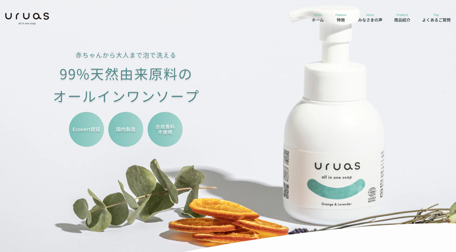 uruasは、植物由来成分99%配合、エコサートコスモス認証取得、8つのフリー処方を実現したオーガニック泡ソープ。